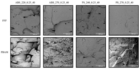 Scanning electron microscopy (SEM) micrographs of tensile fractured ABS and PS specimens produced via FFF and PBAM.