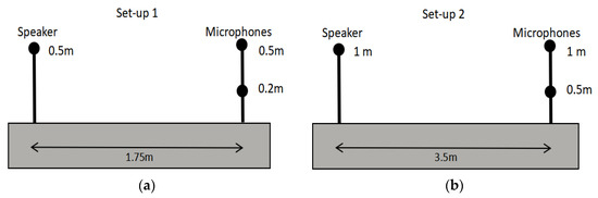 As can be seen in Figure 1, Set-up 1 uses one speaker and two microphones. The horizontal distance between the speaker and the microphones is 1.75 m, the height of the speaker is 0.5 m, and the heights of the two microphones are 0.2 m and 0.5 m. Similar to Set-up 1, Set-up 2 also uses one speaker and two microphones, but the distance between the speaker and the microphones is twice that of Set-up 1, i.e., 3.5 m. Accordingly, the heights of the speaker and microphones are doubled to 1 m, 1 m and 0.5 m, respectively.
