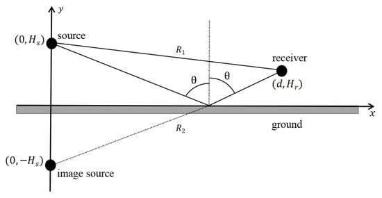 A schematic diagram of the image-source method is shown in Figure 3, where a point source and a receiver are located in a homogeneous atmosphere. With the source and receiver, the x-y coordinate system is set up, with the ground as the x axis, and the y axis perpendicular to the x axis through the sound source; the intersection of the x and y axis is the origin. The source is at the position of (0, ) and the receiver is at the position of (d, ). Symmetric with the sound source above the ground, the image source has coordinates of (0, −), and the reflection point is where the line between the image source and the receiver intersects at the ground. The angle between the vertical line and the line from the reflection point to the receiver is the reflection angle, which is equal to the incident angle. From the geometry in the figure, the direct distance between the source and the receiver , the distance between the image source and the receiver , and the reflect angle can be calculated easily.