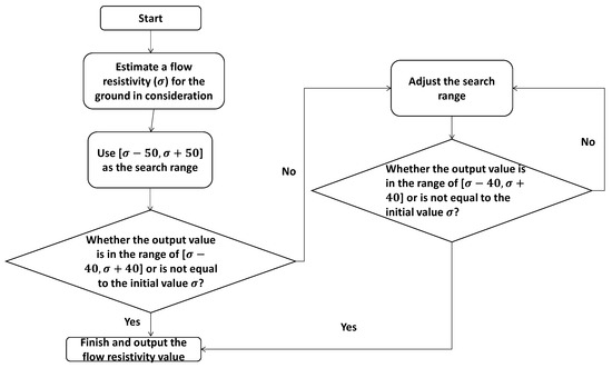 The range of flow resistivity is determined in the following steps: first, estimate the flow resistivity () of the ground to be measured. Second, set the first range with the estimated value of flow resistance. Third, check the output value: if the output value is within , then change the range to ; if the output value is within , then change the range to ; if the output value is equal to the initial value (σ), then change the range to or to ; otherwise, output the value. Take the middle point in the range as a new σ value, and repeat the steps above. If the minimum error is found with the initial value after changing the range as described previously, the output value is equal to the initial value.