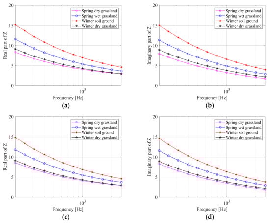 Figure 5 shows the acoustic impedance of the four grounds calculated by using the improved method. The real and imaginary parts of the ground acoustic-impedance decrease when the frequency is increased, and the decreasing speed is slower when the frequency is increased. Additionally, the ground acoustic-impedance is highest in the case of the soil ground in winter, followed by the cases of wet grassland and dry grassland. This is in line with the general law. Moreover, the ground acoustic-impedance of the dry grassland in winter is slightly higher than that in spring, because the grassland is slightly sparse in winter and the soil has a greater influence on the sound. As a conclusion, wind turbines should be erected in dry and vegetated areas.