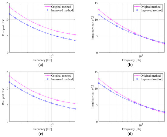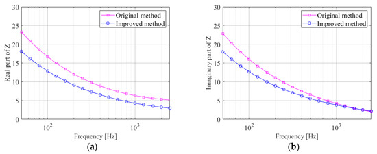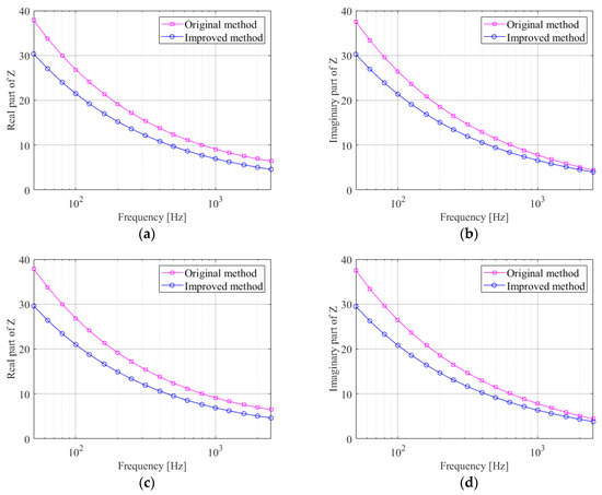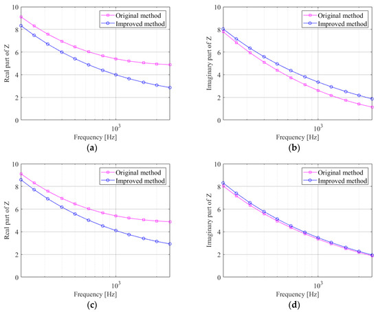 Figure 6, Figure 7, Figure 8 and Figure 9 are the comparisons of the real and imaginary parts of the ground acoustic-impedance for the four grounds, calculated using the improved method and the original method. Ground 1 and Ground 2 were measured at frequencies above 200 Hz and the ground acoustic-impedance was measured at frequencies from 50 to 2500 Hz for Ground 3 and Ground 4 as the distance between the speaker and the microphones was doubled.