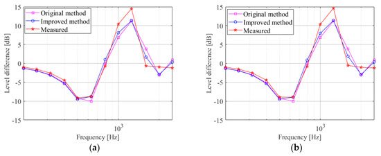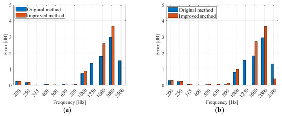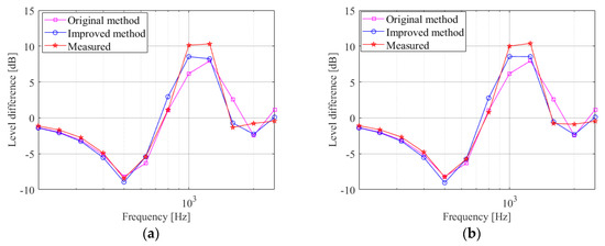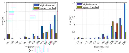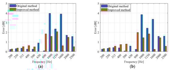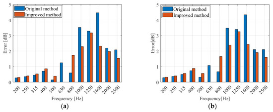 In order to show the errors between the calculated and experimental values more clearly, this paper graphically presents errors () between the calculated sound–pressure-level difference obtained using the improved method and the experimental data, and the error () between the original method and the experimental data, in Figure 14, Figure 15, Figure 16 and Figure 17. The unit of error is the decibel [dB].