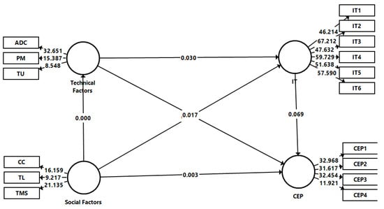 Table 6 shows the hypothesized relationship and effect size between study variables. Based on the analysis, the association between social factors and CEP (β = 0.334, f2 = 0.059, p < 0.05) is positive and significant. Hence, H1 has been accepted. Likewise, the statistical analysis highlight that the relationship between social factors and technical factors (β = 0.744, f2 = 1.241, p < 0.05) is significant and positive. Thus, H2 has been accepted. Furthermore, the empirical results indicated that technical factors have a positive and significant relationship with IT4.0 (β = 0.203, f2 = 0.027, p < 0.05). Hence, H3 has been accepted. Moreover, the results highlight that social factors and IT4.0 (β = 0.7396, f2 = 0.103, p < 0.05) have a positive and significant association. Therefore, H4 was supported and accepted. The analysis also indicated that the association between IT4.0 and CEP (β = 0.126, f2 = 0.014, p < 0.05) has been positive and significant. Thus, H5 has been accepted. Finally, the relationship between technical factors and CEP (β = 0.246, f2 = 0.034, p < 0.05) has been positive and significant. Hence, H6 has been accepted.