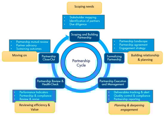 The Bali Principles for partnership serve as the guidelines for working together, which take into consideration aspects such as voluntary, self-organizing, multi-stakeholder approach, with shared responsibility, communication, and mutual respect, to mention a few [21]. Proper understanding of, and attention to, the ‘nine building blocks’ introduced by The Partnering Initiative (TPI) are critical to the overall design, management, and implementation of a multi-stakeholder partnership [15]. TPI and the UN Department of Economic and Social Affairs model of the partnering process is divided into four main stages and twelve phases, and it is a shorthand method to identify the main stages in general collaboration and the different aspects that can be considered when working on such collaboration [22].