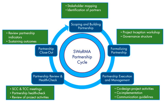 Partnership is a framework within which effective and efficient programs and projects can be delivered through the process of co-creating and co-implementing [18]. It requires different actors to contribute diverse resources, such as finances, knowledge, expertise, and networks to co-create and resolve challenges collaboratively and achieve the goals of the partnership. Projects fail in the long run because normally they cannot cope with the bottlenecks arising from various factors such as financial, geographical, socio-economic, political, and governance, which constitute barriers to partnerships [19]. Another reason is the lack of attention paid to these important factors during the initial phase of project planning or conception [15,18]. SWaRMA, from its conceptualization phase, focused on rigorous planning to bring the partners together, build capacities to enable partners to voice their concerns and expectations from the project, and identify the core strengths of the partners for strategic engagement and partnership. Partnership sessions and workshops were designed with a specific focus on partners and the partnerships approach based on the understanding that, if partnerships are to be successful, they must be grounded in the key principles of synergy, equity, openness, mutual benefit, and courage [18,20].