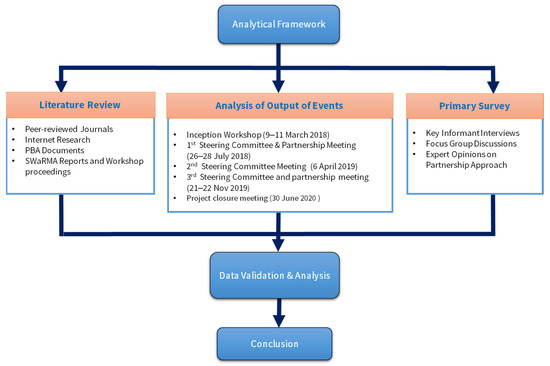 The primary survey targeted key informants, which was accompanied by focus group discussions with representatives from partner organizations (government and academic institutions) and interviews with external experts on partnership management. The questions that guided the discussion by partners to elicit the value added by the multi-stakeholder approach in implementing WRM in Afghanistan included the incentives/benefits of the partnership, possible institutional contributions towards the implementation of SWaRMA, and possible synergies with other programs that have been or are being implemented in Afghanistan. The information collected from various sources were validated and analysed to derive conclusions regarding the multi-stakeholder partnership approach (Figure 4).