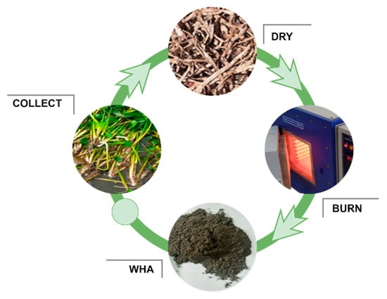 Figure 2 shows the main steps of the WHA production process. Firstly, water hyacinth was manually collected from Lake Tana in Bahir Dar, Amhara National Regional State, Ethiopia, because the use of machinery was prohibitively expensive. It is important to note that the manual collection method is a time-consuming and labor-intensive activity. Then, the collected samples were washed and cleaned with potable water to remove dirt and impurities. Thereafter, the washed samples were cut uniformly into smaller pieces and sundried for over a week. Finally, the WHA was found after the dried water hyacinth samples were burned in a Muffle Furnace at 800 °C for 6 h and cooled at room temperature for 24 h to convert the organic matter into an inorganic substance. The samples were then ground using a milling machine and sieved down to 150 µm. WHA samples passed through a 150 µm sieve were used as a cement replacement material [].