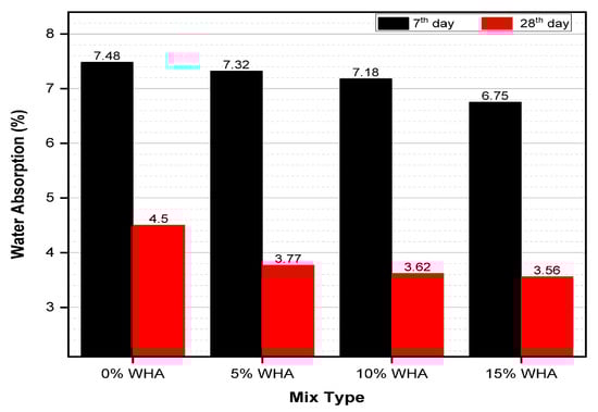 The water absorption of each concrete mixture was evaluated after 7 and 28 days of curing according to ASTM C 642 []. As shown in Figure 4, the water absorption of concrete significantly reduced as the age of the concrete increased. On the other hand, as the percentage of WHA cement replacement increases, the concrete absorbs slightly less water. This demonstrates that voids in WHA-replaced concrete are fewer and nonporous when compared with the control-mix concrete. The increase in mass expressed as a percentage of dry mass was used to analyze water absorption. It is evident that the cover concrete rapidly lost water while curing due to hydration. For concrete with a control mix, surface water absorption was 7.48% and 4.5% after 7 and 28 days, respectively. This higher water absorption could be attributed to the higher porosity of the concrete preserved on the surface due to air []. The amorphous phase of WHA may facilitate the hydration reaction and result in fewer unhydrated WHA particles, decreasing water absorption in the concrete samples [].