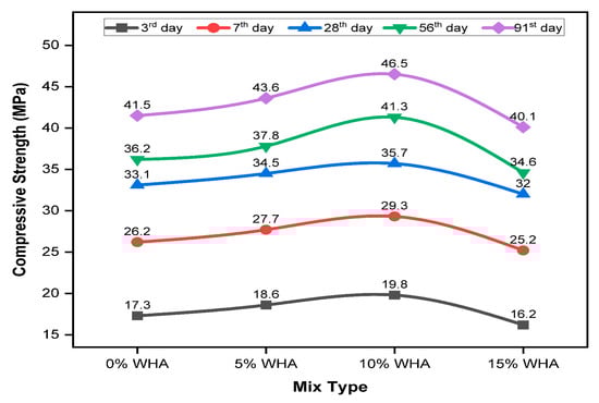 To test the compressive strength of the hardened concrete, first, the concrete cube samples were immersed in a water tank containing clean water at a normal temperature of 25 ± 2 °C for curing ages of 3, 7, 28, 56, and 91 days, then they were dried for 24 h in the open air. The result of the test for each sample in all curing periods is shown in Figure 5. From the figure, it can be seen that, except for the 15% WHA-containing samples, the compressive strength of all concrete cubes increased incrementally with the WHA replacement level with respect to the normal (0% WHA) concrete. The figure also reveals that all samples, including the 15% WHA, achieved both the designed (25 MPA) and mean target (33.5 MPa) compressive strength at the later age of 28 days, and the result is supported by [,,]. Compared with the 0% WHA, at 28 days, the strengths were improved by 1.4 MPa (4.23%) and 2.6 MPa (7.85%) for 5% WHA and 10% WHA, respectively, whereas the 15% WHA samples decreased by 1.10 MPa (3.23%). It can also be seen that the strength increased with curing age for all of the samples. Among the 56-day strength enhancements obtained above for concrete containing 10% WHA, a remarkable enhancement of (42%) was obtained with respect to the reference control mix. This enhancement could be related to a higher amount of calcium–silicate–hydrate (C–S–H) formed as a consequence of WHA addition. The main reason for the improvement in concrete compressive strength is the pozzolanic reaction from WHA and calcium hydroxide, which promotes the formation of hydrated calcium silicate. However, concrete without WHA can only rely on cement to hydrate into a small amount of C–S–H. Hydrated calcium silicate is one of the most important elements that provide strength. Therefore, the compressive strength of concrete with 10% WHA achieved maximum strength and was the optimum replacement level; the result is in agreement with previous findings []. According to [,], the incorporation of more than 10% WHA in cement concrete continuously decreased the compressive strength because increasing WHA content would greatly accelerate the rate of hydration in the concrete, resulting in the early evaporation of water from the mix before the full reaction could occur, resulting in a reduction in compressive strength.