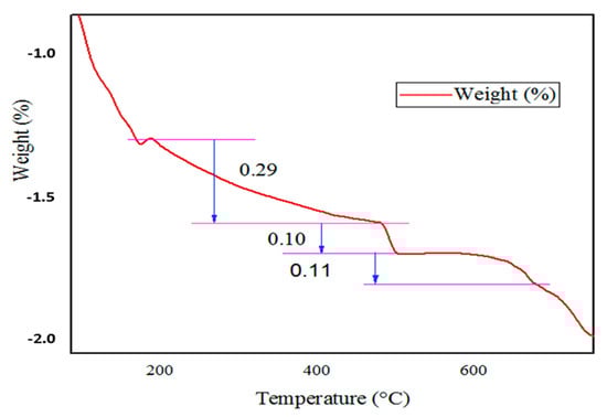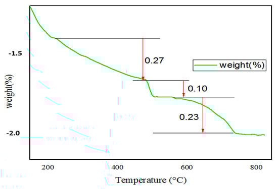 In the TGA technique, the sample is first heated, and the mass change due to heating is recorded as a derivative thermogravimetric (DTG) curve. In studies on cementitious samples, the most significant mass changes are the mass loss due to H2O release (dehydration, dehydroxylation) until they reach 550 °C and above 550 °C due to CO2 release (decarbonation). In a sample that was treated with isopropanol and left in a vacuum to remove the free water, the mass loss until it reached 550 °C corresponded to the amount of bound water in the hydrate phases []. Between 450 and 550 °C, the main thermal transition (endothermic) was seen. The mass loss at this temperature range can be used to determine the amount of calcium hydroxide in the sample []. This peak indicates that Ca(OH)2 or C–H breakdown occurs during heating, resulting in a considerable mass loss in the sample. Between 550 and 850 °C, a slight second peak was noticed, which is thought to be caused by the dissolution of CaCO3 and the loss of water from the C–S–H gel. A low Ca/Si ratio suggests that C–A–S–H gel crystallinity reduces with increasing Al concentration and that increased Al-absorbed content results in more C–A–S–H phases. The following list of chemical reactions can be used to characterize the breakdown processes [].