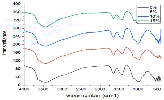 Figure 9 and Figure 10 show the infrared spectra of selected WHA mixes (0% WHA, 5% WHA, 10% WHA, 15% WHA) at curing ages of 7 and 28 days (with main bands marked). The results show that the wavenumbers and curves of the 7- and 28-day pastes were essentially the same, indicating that the hydration products did not change with the development of the hydration process, with the exception of the 7th-day samples, in which the number of hydrated quartz particles was higher than that of the 28th-day samples, where the wavelength stretched for the 10% WHA mixes. In the sample with the highest percentage of 10% WHA samples, the unreacted particles displayed a sharply intensified peak at wave numbers 470, 600, and 770 cm−1. This indicates an incomplete activation reaction, which increased the amount of partially reacted and unreacted particles in the sample and decreased its mechanical strength. This is consistent with the earlier discoveries of [].