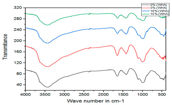 Figure 9 shows the infrared spectra of all 7-day samples, with spectra ranging from 500 to 4000 cm−1 for the characteristic wavenumber and the associated functional groups of cement paste. From the result of the FTIR spectrum analysis of WHA, the major peaks were as follows: 3650, 3720, 2350, 2290, 1500, 920, 889, and 680 cm−1. Due to the presence of calcium in the sample, a low wavenumber band can be observed at 684 cm−1. H–O–H band vibrations were found at the peak value of 1500 cm−1. The peak value of 684.15 cm−1 indicates asymmetric stretching vibrations in Al–O bonds due to anhydrous WHA. Other researchers have observed T–O bond-stretching at the peak values of 966 cm−1 and 1635 cm−1, which correspond to H–O–H bonds and Al–O bonds at a wavenumber of 688 cm−1 [].
