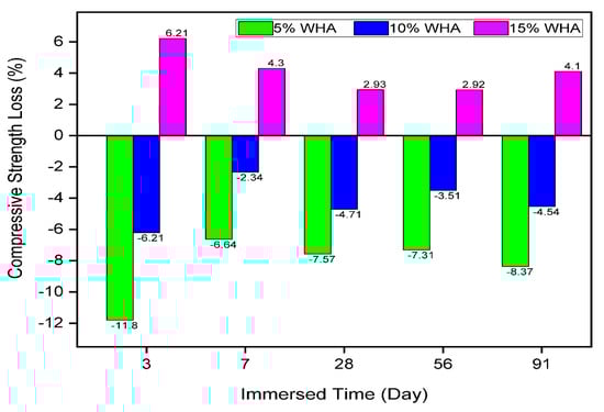 Several past studies have revealed that mortar and concrete produced with pozzolans with OPC performed better against sulfate attacks than plain OPC mortar and concrete. The deterioration of concrete due to sulfate attack is mostly measured in terms of weight loss, strength change, spalling, cracking, and expansion []. The changes in compressive strength loss in the percentage of hardened concrete made with 5%, 10%, and 15% WHA compared with the control mix (0% WHA) immersed in 5% Na2SO4 solution for 3, 7, 28, 56, and 91 days are plotted as a function of immersed curing time in Figure 11. A higher negative relative percentage indicates greater resistance to sulfate attack and higher positive results for lower resistance and vice versa []. The result in the figure shows that, for 5% and 10% WHA replacement levels for OPC, the concrete samples had better resistance to sulfate attack for all immersed curing times. Notably, after 56 days of curing time, both the 5% and 10% WHA samples outperformed 100% OPC concrete samples in terms of sulfate resistance, with 7.31% and 3.51%, respectively. On the other hand, they achieved 8.37% and 4.54% after 91 days of immersed time. However, a deterioration in compressive strength due to sulfate attack was observed when the cement was replaced with 15% WHA for all immersing periods. For instance, its compressive strength decreased by 6.21% (1 MPa) and 4.1% (1.7 MPa) for 3- and 91-day immersions, respectively. In addition, for all concrete samples, the sulfate attack resistances decreased when the samples were kept in sulfate solution for up to 28 days and gradually improved at the later age of 91 days. The ettringite and expansive gypsum that are formed as a result of sulfate attack are most likely the cause of degradation, cracking, spalling, and expansion in 100% OPC concrete. When OPC paste is submerged in sulfate solutions, the stiffness of the material reduces, and the water absorption values of ettringite increase, resulting in the formation of gypsum and ettringite [,]. Another problem is that by lowering cohesion in the hydrated OPC paste, as well as reducing adhesion among the aggregate particles, the expansion and cracking caused by sulfate attack enhances the compressive strength loss of concrete specimens []. Therefore, WHA plays a major role in OPC concrete by improving its sulfate resistance; 5% WHA is the maximum replacement level to resist any effects on the concrete and provides better resistance to sulfate attacks.