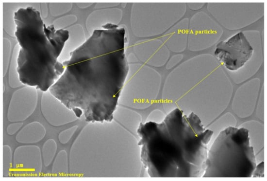 Figure 2 shows the transmission electron microscopy (TEM) image of ground POFA, indicating the particles’ morphology. The ash was ground for 6 h to reduce the median particle size to below 10 µm. The shape of the POFA particles was spherical, exhibiting some clustering.