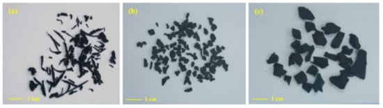(a) Fine fiber rubber aggregate—Type R1. (b) Fine granular rubber aggregate—Type R2. (c) Coarse granular rubber aggregate—Type R3.