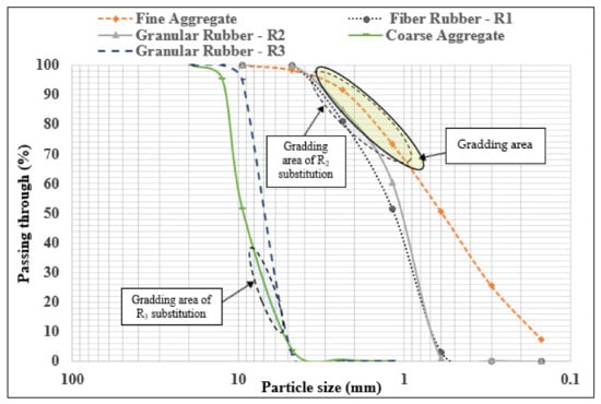 Figure 5 shows the limitation of grading area where the TRAs replaced the natural aggregates. Rubber aggregate types R1 and R2 partially replaced the fine aggregate in the proposed concrete mix. Meanwhile, rubber aggregate type R3 partially replaced the coarse aggregate. The substitution was based on the grading of TRAs, avoiding the extra pores and consequently reducing the CS of the resulting concrete.