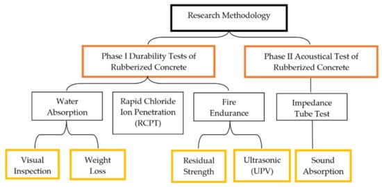 As shown in Figure 6, Phase I dealt with the durability assessment of the rubberized concrete, namely: Step 1 evaluated the porosity of rubberized concrete and its water absorption in accordance with existing standards; Step 2 assessed the resistance against chloride exposure; and Step 3 assessed the fire performance of the rubberized concrete. Phase II dealt with the assessment of the acoustic properties of the rubberized concrete, namely: Step 1 prepared various specimens with proper dimensions according to the existing methods of the testing procedure; and Step 2 evaluated the sound absorption properties of the rubberized concrete using the impedance tube test.