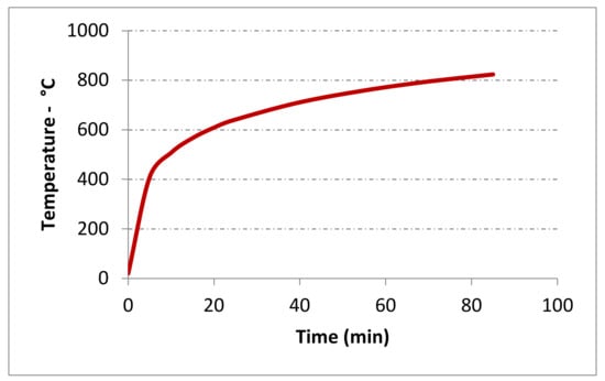 The durability test determined the effects of elevated temperature and rubber particle size and shape, on the chloride penetration and water absorption of the rubberized concrete. The water absorption and rapid chloride penetration test (RCPT) were conducted based on ASTM C1202 and ASTM C642 protocols, respectively. The objective of the fire test was to explain the behavior of the rubberized concrete on exposure to high temperature. Different types and amounts of rubber particles were used for the comprehensive evaluation of the post-fire properties of the rubberized concrete. The rate of heat development in the furnace was compared with a standard rating recommended by ISO 834 (ISO, 2012). An automatic electric furnace (Carbolite Furnace 1100) was used to simulate the fire situation at various temperatures (27 ± 2 °C to 150 °C, 300 °C, 500 °C, and 800 °C) up to a maximum of 1200 °C. This range of elevated temperature was suggested and applied by Al-Mutairi et al. (2010) for the evaluation of rubberized concrete performance. The specimens were kept at the designed temperature for one hour to simulate an actual fire situation. The specimen at ambient temperature (27 ± 2 °C) was used as the control, and tested to compare the post-fire properties of the rubberized concrete. Figure 7 shows the temperature against time curve. The loss of CS, loss of weight, and UPV were determined to evaluate the post-fire properties of POFA-included rubberized concrete.