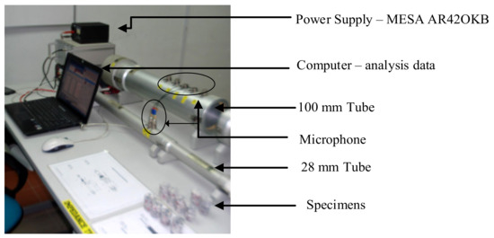 As shown in Figure 8, the two-microphone transfer-function (impedance tube) method was used in accordance with the ASTM E1050-10 standard to measure the impedance and absorption of the acoustic concrete. The absorption coefficient and acoustic impedance of sound absorbance by the materials (circular-cut in small samples) were measured in the range of 100 to 6000 Hz. The improvement of the acoustical properties of the modified rubberized concrete was carried out using “Acoustic Material Properties Measurement System SCS9020B—Kundt/T60/TL Tubes” as a complete set of hardware and software tools. The acoustic property, sound absorption coefficient (α), was recorded. The “SCS 8100” software was utilized to record the data. In this study, the rubberized concrete was exposed to low frequencies from 100 to 1000 Hz, and high frequencies from 1000 to 5000 Hz, to evaluate the effect of different sizes and levels of tire aggregates in concrete. Moreover, sound absorption can be represented as a single value, this value can be described as the noise reduction coefficient (NRC). The noise reduction coefficient expresses the scale of the amount of sound energy absorbed by the material surface. The noise reduction coefficient ranges from 0 (total reflection) to 1.00 (total absorption). The noise reduction coefficient was calculated as the average of the sound absorption at frequencies of 250, 500, 1000 and 2000 Hz. The noise reduction coefficient (NRC) was estimated via: