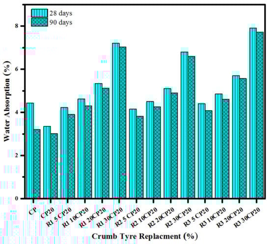 Figure 9 illustrates the water absorption of the various modified rubberized concretes at 28 and 90 days. The water absorption values were 3.43 and 3.35% at 28 days, and 3.21% and 3.02% at 90 days, for plain and 20% POFA replacement, respectively. The water absorption of the rubberized concrete containing type R1 concrete varied from 4.22% to 7.21% at 28 days, and from 3.9% to 7.03% at 90 days, depending on the fine fiber rubber content. The water absorption behavior of the concrete was affected by the level of rubber replacement, and increased with the increase in rubber content. Similarly, the absorption behavior of R2 rubberized concrete was in the range of 4.15% to 6.8%, and 3.82% to 6.6%, at 28 and 90 days, respectively. The lowest level of water absorption was obtained in concrete with 5% rubber replacement, which was 4.15% and 3.82% at 28 and 90 days, respectively. The highest level of porosity was obtained for the concrete R2 30CP20 with percentages of 6.8% and 6.6%, at 28 and 90 days, respectively. A similar trend was observed for concrete incorporated with R3 aggregates where the water absorption was in the range of 4.4% to 7.9%, and 4.08% to 7.72%, at 28 and 90 days, respectively. In general, the presence of coarse rubber aggregate (R3) increased the water absorption of the designed concrete because of the weak cement-paste–rubber-aggregate interactions. Ganjian et al. [53] reported that the water absorption of rubberized concrete can increase with the increase in particle size and amount of rubber aggregate. Furthermore, the water absorption of R1 concrete was slightly higher than that of R2 concrete, possibly because of a deviation of rubber particle size owing to the sand grain size distribution and an increase in the amount of air trapped during mixing procedures. Therefore, the results demonstrated that the water absorption of the rubberized concrete was higher than that of normal concrete. Moreover, the particle size of rubber, level of concentration, and type of rubber aggregates affected the level of water absorption. Coarser rubber particles were found to increase water absorption, compared with fine particles. Meanwhile, among fine rubber aggregates, the fine granular ones showed lower absorption than the fine fiber rubber aggregates.