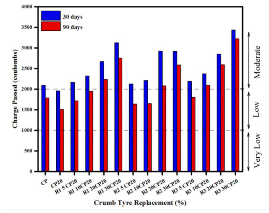 Figure 10 displays the impact of adding 20% POFA on the rate of reduction in chloride penetration. The rate of coulombs charge passed was reduced to 1956 and 1506 c at 28 and 90 days, respectively. Inclusion of 20% POFA was shown to improve the performance in terms of increased resistance to chloride penetration, compared with normal concrete. The rate of increase in the reduction in chloride penetration was 23%. The permeability resistance of POFA concrete was improved because of the pore refinement within the concrete micro-structure induced by POFA, or the transformation of large permeable pores into smaller ones [56]. The results of the permeability by chloride ion penetration for R1 rubberized concrete were in the range of 2165 to 3128 c at 28 days, and 1720 to 2757 c at 90 days. It was observed that chloride ion penetration could systematically increase with the increase in concentration of R1 rubber aggregates. The same trend was observed for R2 rubberized concrete wherein the chloride ion penetration increased from 2122 to 2916 c, and from 1640 to 2584 c, at 28 and 90 days, respectively. Moreover, type R2 rubberized concrete showed lower chloride ion penetration, compared with type R1 rubberized concrete in which air was easily trapped by the rough surface of the tire particles [44]. The progressive increase in chloride ion penetration with increasing rubber content may be attributed to the weak bonding between rubber particles and cement paste [57]. These results are supported by Ganjean et al. [53] and Gesoglu and Guneyisi [54], who acknowledged an increase in permeability at higher concentrations of rubber particles. The chloride ion penetration of concrete containing R3 particles was the highest among all types of rubberized concrete, irrespective of the rubber content. However, this was more pronounced in concrete made with 20% and 30% R3 rubber content. In summary, type R1 rubberized concrete showed the best performance in the chloride ion penetration test. Despite the fact that coarser rubber particles yielded increased permeability, the obtained result showed that all types of rubberized concrete were classified at the low to moderate level of permeability according to ASTM C 1202, C2012.