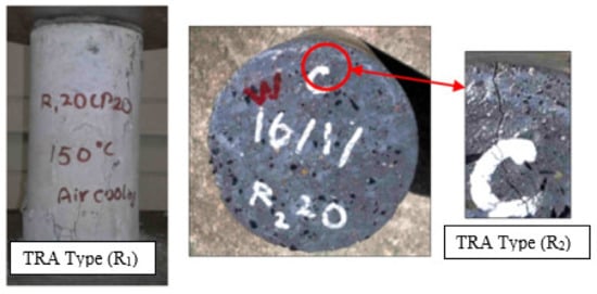 The surface of concrete containing 20% and 30% rubber particles types R1 and R2 showed crazing at 300 °C (Figure 12). The numbers of hairline cracks increased with the increase in rubber content, but these cracks were exiguous and tiny, and no soot was detected on the surface of the heated samples. The same observation was reported by Marques et al. [50] for rubberized concrete subjected to elevated temperatures. These cracks may have been due to the difference in the heat capacities of rubber and natural aggregates that caused different responses to high temperature, especially with decreasing moisture content. The impact of heating at 300 °C was more pronounced for concrete containing coarse rubber aggregates than for both fine types of rubber aggregates. The outer surface of the rubberized concrete specimens containing coarse rubber particles were significantly affected by cracks and pop-outs. Meanwhile, no surface pop-outs were observed in R1 and R2 concrete except some hairline cracks in concrete containing 20% and 30% fine rubber particles.