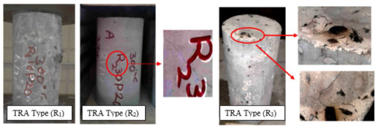 The resistance and stability of structures during a fire is the most important criteria in the safety of buildings. Compared with wood and steel structures, concrete generally exhibits good capability for sustaining resistance and stability under fire exposure. Naturally, concrete is incombustible and does not emit gas or toxic smoke and fumes when exposed to fire. Although concrete can retain sufficient strength at high temperatures, it deteriorates when subjected to intensive temperatures in the range of 100 °C to 800 °C for a long time. Thus, the durability of concrete structures at high temperatures reduces the risk of structural collapse [58,59]. To validate this claim, we evaluated the effect of elevated temperature on the proposed novel concrete containing TRAs.