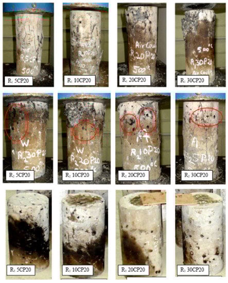 A comparative evaluation of the UPV values of the prepared rubberized concrete before and after exposure to elevated temperatures was performed (Table 4). Notably, the UPV value was reduced by increasing the rubber concentration in the concrete mixture under normal conditions (ambient temperature). This reduction could be attributed to the material properties of rubber aggregate, which naturally has the potential to dampen the wave velocity transfer. The UPV values at ambient temperature were between 4600 and 4300 m/s for 5 and 30% rubber content, respectively. According to Neville [60], these values were optimum to achieve excellent to good quality concrete. At 150 °C, the UPV values were in the range of 4575 to 3400 m/s for 5 to 30% rubber particle replacement, respectively. This trend continued at 300 °C and 500 °C. At 500 °C, the UPV values for 20 and 30% rubber content were at a very low range, reflecting that the quality of rubberized concrete was strongly affected by heating. The quality of concrete incorporated with high concentrations of rubber particles (20 and 30%) dropped sharply after being heated to 500 °C. Finally, at 800 °C, an excessive number of cracks and pores caused the values of UPV to be undetectable for 20% and 30% rubber content. The UPV values of the concrete incorporated with 20% and 30% fine fiber rubber aggregate was undetectable because of the large number of cracks and voids resulting from the decomposition of materials under high temperature. This observation supported the low values of residual compressive strength for R₁ 20CP20 and R₁ 30CP20. In brief, UPV values reduced with the increase in temperature [65]. This effect was more pronounced in concrete made with rubber aggregate, especially those exposed above 500 °C.