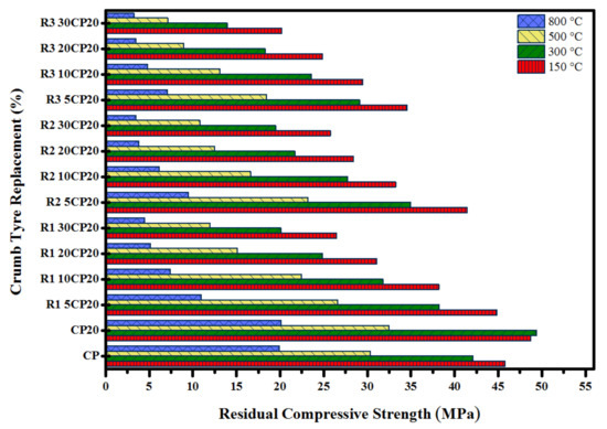 Residual CS of the proposed rubberized concrete at various temperatures.