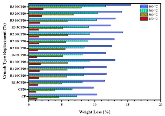 Figure 16 depicts the impact of temperature increase on the weight loss of modified rubberized concrete. The weight loss of specimens made with R1 rubber particles was analyzed at 150, 300, 500, and 800 °C and presented as a percentage of the original weight of specimens at ambient temperature (prior to the heating process). The weight of concrete declined with the increase in temperature. The minimal mass loss was obtained at 150 °C for all percentages of rubber particle replacement. Meanwhile, a steady increase in weight loss in the range of 1.41 to 1.79% for the studied rubberized concrete was observed with the increase in rubber concentration. The weight loss of concrete within this range of temperature was mainly due to the moisture movement from the concrete surface to the surrounding environment [58]. The reduction in weight progressively increased at 300 °C, with percentages of 4.48% for 5% rubber incorporation, and 5.92% for 30% rubber replacement, under the air-cooling regime. Generally, the mass loss increased with the increasing amount of fine fiber rubber aggregate in the concrete at elevated temperature. In addition, the weight loss of concrete containing 10% rubber was in the range of 1.54% to 11.76% after exposure to 150 °C to 800 °C, respectively. Similarly, the weight loss for concrete containing 30% rubber particles was in the range of 1.79% to 13.08% for 150 °C to 800 °C, respectively. This was due to the rubber aggregate decomposition at higher temperatures, that caused a higher mass loss of concrete containing a higher amount of TRA, than the one made with a lower amount of rubber.