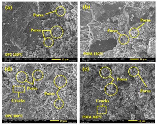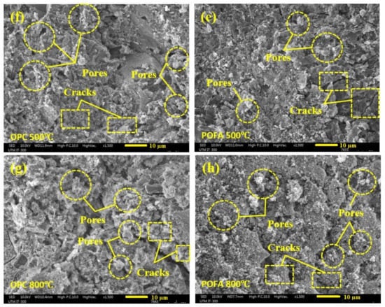 Figure 17 shows an SEM image indicating the effect of POFA as an OPC replacement, on the surface microstructures of concrete exposed to elevated temperatures. The concrete exposed to 500 °C showed some small pores and continuous structure without micro cracks. However, the OPC concrete (Figure 17f) showed lower resistance to elevated temperature, wherein the structural deterioration and number of pores formed was higher than the concrete made with POFA (Figure 17e). Concrete exposed to 900 °C displayed lower structural density compared with the concrete exposed to 500 °C, wherein the number and width of pores and cracks increased with the increase in temperature. Similarly, the concrete made with POFA (Figure 17h) showed a lower number of pores, cracks and less deterioration compared with concrete made with OPC (Figure 17g) exposed to the same temperature. At elevated temperatures, the matrices of POFA showed higher resistance and better performance than OPC.