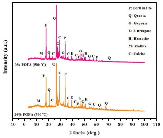 Effect of 20% POFA as OPC replacement on XRD of modified concrete exposed to 500 °C.