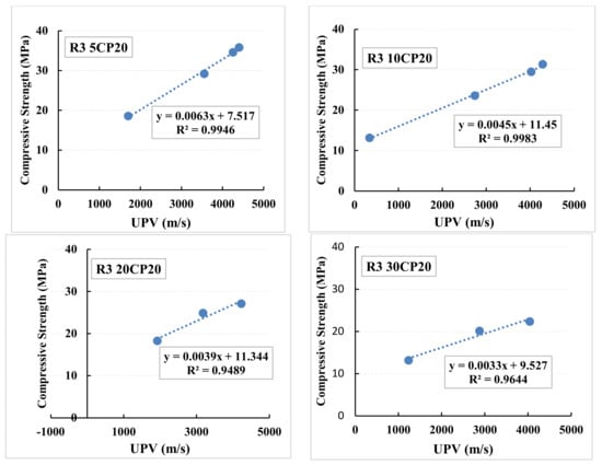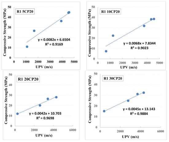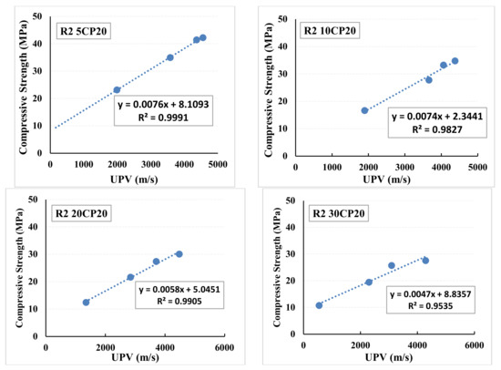 A relationship between the UPV values of the rubberized concrete and its residual compressive strength at various elevated temperatures was ascertained (Figure 19, Figure 20 and Figure 21). The linear regression method was applied to estimate the relative residual compressive strength at various temperatures and UPV values. The proposed equations were plotted for concretes containing 5% to 30% rubber at elevated temperatures. The UPV values and compressive strength at ambient temperature were included in the calculation to improve the clarity of the relationship for concretes made using various amounts of fine fiber rubber particles. The coefficient of determination R2 was presented for every equation that showed the proportion of the variance of residual compressive strength predicable from the UPV values. This value of R2 signified the strength of the linear association between residual compressive strength and UPV values for all elevated temperature levels relative to the amount of rubber aggregate. Linear correlation can be defined by Equations (2)–(5), with the coefficient of determination R2 falling between 0.902 and 0.988 for concrete containing various amounts of type R1 rubber aggregate.