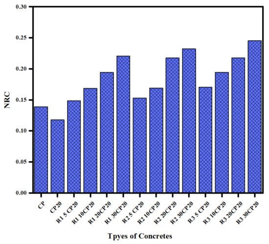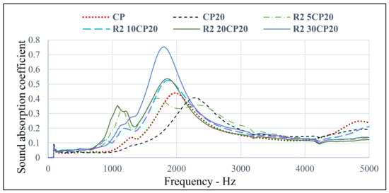 The results of NRC for various rubberized concretes are shown in Figure 23. The values of α for CP20 were slightly higher than for conventional concrete (CP) at a low frequency region (125 to 500 Hz). At higher frequencies, normal concrete showed moderately higher α values than CP20. Moreover, CP20 exhibited better results for frequencies above 2250 Hz. Overall, CP showed better performance (NRC = 0.139) than CP20 (NRC = 0.117). In terms of NRC values, R1 rubberized concrete showed superior sound resistance properties compared with normal concrete. Furthermore, the results indicated a systematic progress in sound resistance as the rubber content was increased. The NRC values for R1 rubberized concrete made with 5 to 30% rubber particles were in the range of 0.1484 to 0.2207. With the increase in rubber concentration, the sound absorption values at both low and high frequencies were improved.
