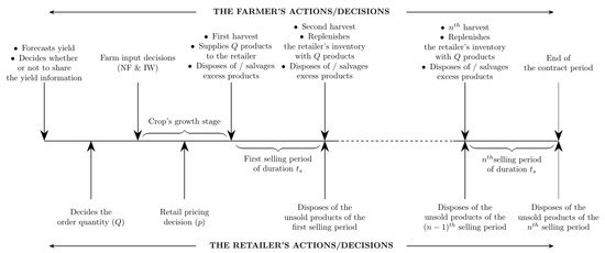 Once the crops are fully grown, they start bearing fruits/vegetables, which the farmer harvests at regular intervals of . The number of harvests in a crop season is n. After each harvest, he supplies Q quantity of these products to the retailer, and the remaining are either salvaged or disposed of. He cannot replenish the retailer’s inventory daily, as the choice of maturity stages and harvesting intervals varies across different fruits and vegetables [56,57]. To assure a daily supply of his products, he can preserve the products of a single harvest and sell only a part of it daily until the next harvest. In our study, this possibility is ruled out; instead, we assume that the farmer sells his entire produce soon after each harvest, as it helps eliminate the holding and preservation costs. Due to the consumer’s dependence on the sensory attributes of the agri-products to evaluate freshness [58,59], their perceived value of freshness will be high at the beginning of a selling period. This results in more sales at the onset of each selling period, encouraging the retailer to let the farmer sell his entire production to her at the beginning of each selling period.
