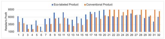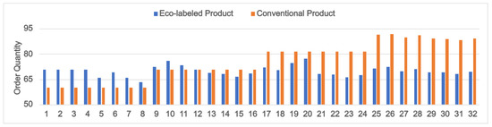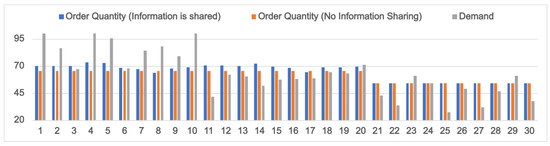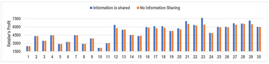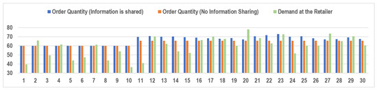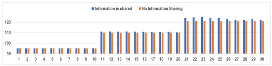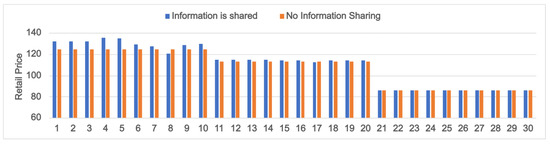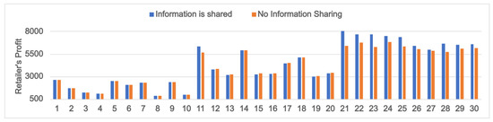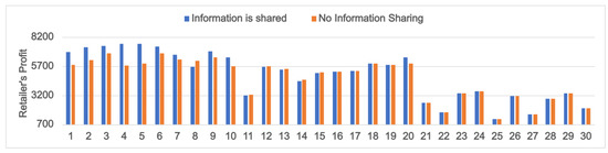- The conditional values obtained in the previous step are shared with the retailer when information sharing occurs, and the retailer makes her decisions based on this shared information. The demand uncertainty in the retailer’s problem () is taken into account by randomly generating a value that is uniformly distributed in the interval .