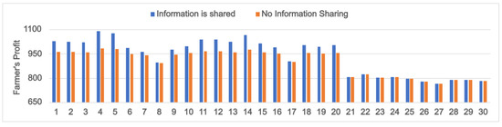 Let us use and to define the pdf and CDF of the corresponding posterior distribution of yield uncertainty (). The farmer can decide whether to share the forecast information, which includes the updated distribution parameters ( and ) with the retailer. In such cases, the retailer makes their decisions based on the shared information. However, in the absence of shared information, they depend on their prior beliefs (). Nevertheless, it is assumed that all other information associated with the farmer is known to the retailer. This is a reasonable assumption as the retailer can access the details of the farm parameters () from the farm records used for green certification [70]. Additionally, the production costs () are generally known to everyone through the maximum retail prices set by the suppliers and irrigation costs set by the authorities. The other farmer related costs () are also known to them as they have access to the agri-food markets.