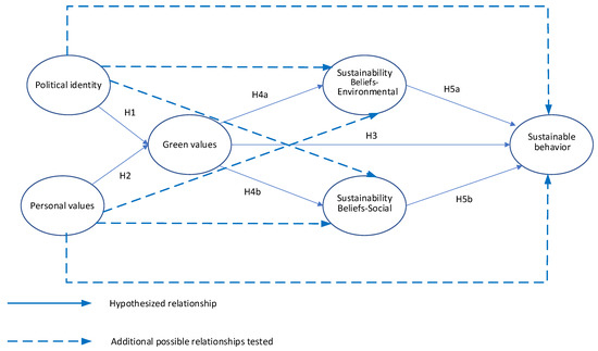 In the following sections, we first develop and present a model of the relationships between political identity, personal values, green values, sustainability-related beliefs, and sustainable consumption. Specific hypotheses and theoretical support for these relationships are first presented, followed by an empirical study testing the model and the hypotheses. Finally, findings of this research are discussed, along with their implications for theory and practice.