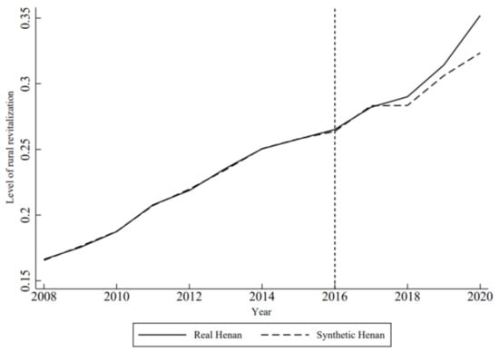 In the process of constructing the “synthetic Henan” by weighting the control group provinces, the weight vector must satisfy and , that is, the sum of “synthetic Henan” weights is equal to 1. After the calculation of the synthetic control method, the provincial weights of “synthetic Henan” are shown in Table 3. The results show that the “synthetic Henan” rural revitalization level includes six provinces. Among them, Shanxi Province has the largest weight of 0.494, Yunnan Province has the second largest weight of 0.237, and the sum of the weights of the remaining provinces is 0.269. It is worth noting that there is no linear relationship between the weights of these six provinces, and the corresponding province categories and synthetic weights will change when the treatment group is changed, so there is no need to worry about the problem of linear endogeneity.