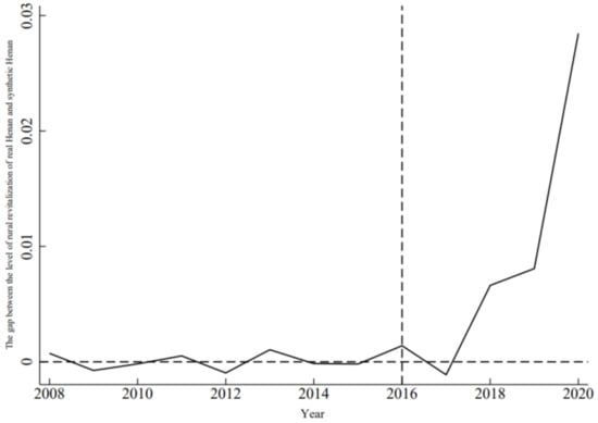 Figure 1 shows the comparison between the rural revitalization level of “real Henan” and “synthetic Henan” from 2008 to 2020. The solid line shows the growth trend of the rural revitalization level of “real Henan”, while the dashed line shows the changing trend in the rural revitalization level of “synthetic Henan”, and the vertical line is the dividing line in 2016. As can be seen from Figure 1, before the establishment of the pilot zone for inclusive financial reform in Henan Province in 2016, the changing trends in the rural revitalization levels of “real Henan” and “synthetic Henan” are the same and show an obvious overlap, which indicates that the synthetic control method can better fit the rural development of Henan before 2016, which also responds to the data characteristics in Table 3. Since the establishment of the pilot zone for inclusive financial reform in Henan in 2016, the rural revitalization level of “real Henan” has gradually surpassed that of “synthetic Henan”, and the gap between the two has been expanding, which indicates that with the implementation of the pilot policy of inclusive finance, the level of rural revitalization of the pilot provinces will be significantly improved and gradually higher than that of the non-pilot provinces with similar rural development. It is worth noting that between 2016 and 2017, the level of rural revitalization of “real Henan” and “synthetic Henan” remained a good fit until after 2017 when the gap between them appeared to widen significantly. The possible reason is that there is a certain time lag in the policy effect of the inclusive finance pilot on the improvement of rural revitalization level.