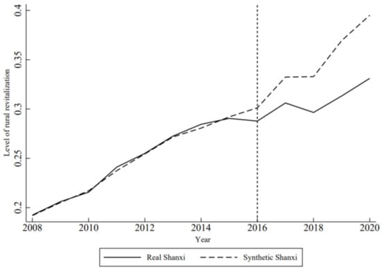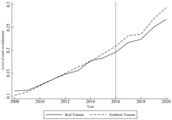 Predictor variables in the synthetic control method often affect the fitting effect of synthetic control objects and the robustness of the conclusion. Therefore, considering the development basis of the pilot zone for inclusive financial reform, this paper selects predictor variables that can influence the outcome variables as much as possible, which mainly include six variables: (1) GDP per capita (LnpGDP); there is no doubt that the level of economic development has an impact on the revitalization of rural areas. (2) Industrial structure (Ind); Wang et al. [] found that reducing the proportion of primary industry and animal husbandry development while increasing the proportion of rural secondary and tertiary industries can help to promote rural poverty alleviation and rural revitalization in the future. (3) Financial support for agriculture (Gov); generally speaking, local financial input can help to promote rural economic construction and maintain stable rural development. (4) The degree of investment in fixed assets per capita in rural areas (Fix); Jin et al. [] confirmed that an increase in the proportion of fixed asset investment can attract the return of capital, talent, technology, industry, and other resource factors, which can further have an important impact on China’s agricultural economy. (5) The aging of the rural population (Age); most scholars believe that the impact of population aging on the rural economy is heterogeneous. For example, Liu et al. [] found that aging of the population probably brings social security pressure, labor shortage, and other problems in the short term; however, after reaching a certain level, the labor shortage and rising costs caused by the disappearance of the demographic dividend can form a reverse force mechanism for the transformation of the agricultural production model, thus promoting the revitalization of rural industries. (6) The urbanization rate (Urb); Chen et al. [] revealed that under the guidance of the two strategies of new urbanization and rural revitalization, the transformation from “urban bias” to “urban-rural integration” can help to narrow the gap between urban and rural development and promote high-quality development of the rural economy. (7) Activity of the rural market (Mar); in general, enhancing the activity of rural consumer markets can help boost domestic demand and support rural economic growth. In addition to the above variables, this paper also randomly selects the outcome variables of some years before the policy implementation as predictor variables, which are the level of rural revitalization in 2008, 2012, and 2015 (4) (in the Appendix A).