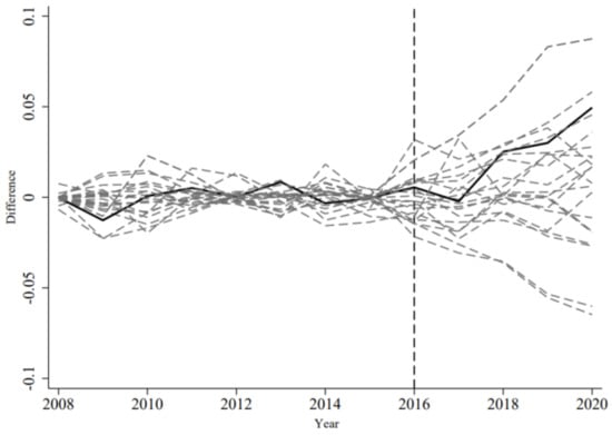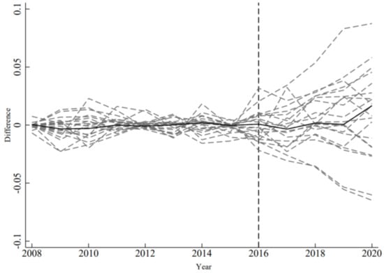 In order to further visualize the trend in the difference between the level of rural revitalization of “real Henan” and “synthetic Henan” before and after the policy implementation, this paper uses the synthetic control method to measure the difference between the level of rural revitalization of “real Henan” and “synthetic Henan” between 2008 and 2020, shown in Figure 2. It can be seen from Figure 2 that before 2016, the gap between the rural revitalization level of “real Henan” and “synthetic Henan” always fluctuated around the “zero value”. However, after the establishment of the pilot zone for inclusive financial reform in Henan in 2016, the gap between the two showed a trend of “slight reduction–significant increase”. That is, during the period from 2016 to 2017, the gap between the level of rural revitalization between “real Henan” and “synthetic Henan” was still relatively small due to the existence of policy lag. While after 2018, the policy advantages of Henan Province were gradually transformed into development advantages, and the gap between the two gradually increased. The above results indicate that the pilot zone can significantly promote the level of the rural revitalization; and with the continuous improvement of the policy, its promotion effect becomes more and more significant, which again confirms the policy effect of the establishment of the pilot zone for inclusive financial reform in Henan Province. Therefore, the research hypothesis H1 holds.