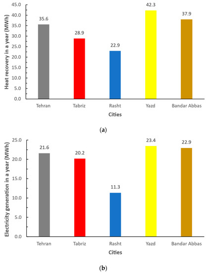 In this study, five cities with different climatic conditions in Iran are studied. They are all among the populated cities of the country. These five cities are Bandar Abbas, Tabriz, Tehran, Rasht, and Yazd. Important city with the information is given in Table 2. Moreover, the considered values of key parameters which are utilized for modeling BIPV/T system are given in Table 3. The indicated temperature values in Table 3 for the summer and winter are for the outdoor design condition (5 a.m. in December and 3 p.m. in July, respectively). The American society of heating, refrigerating, and air-conditioning engineers (ASHRAE) has suggested using the indicated design condition for modeling the weather data during the year. By employing the design temperature values, the weather profile could be simulated during the year. In this investigation, the carrier hourly analysis program (HAP) is utilized for this purpose, with the procedure fully discussed in the past studies of the research group, including [34].