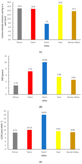 In the absence of a BIPV/T system, the whole electricity for a building is purchased by a thermal power plant [45]. This means that the needed heat is provided by a fossil fuel burning system [46]. Therefore, due to BIPV/T usage, both electricity production in a thermal power plant and fuel consumption in the fossil fuel burning system are saved, and consequently, carbon dioxide is retained, and its release to the environment is prevented [47]. The saved carbon dioxide due to electricity production reduction in a thermal power plant () can be calculated from Equation (24) [18].