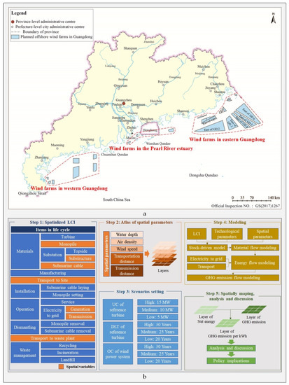In this study, we adopted a spatialized LCI [23] with a spatial resolution of 1 km × 1 km for offshore WPSs and combined it with a stock-driven model [16] to identify physical pathways for mitigating GHG emissions [24] from offshore WPSs. Additionally, the material, energy, and GHG emission ( equivalent) flows were quantified based on a monopile supported turbine model assumption [25,26], the three reference turbines [27,28,29], existing materials [26], energy [30], and GHG emission data for all life-cycle stages [3], and five spatial parameter databases (water depth, air density, wind speed, transportation distance, and transmission distance [20,21]). Moreover, similar to previous studies, 1 of wind farm power generation was used as the functional unit, which was normalized to a common reference for the life-cycle impact assessment results analysis [3,31], and the results were analyzed and mapped using the geographic information system software SuperMap. The three objectives of this work were as follows: (1) provide a spatially differentiated understanding of GHG emissions per of the offshore wind power sector from the point of view of materials metabolism, (2) reveal the mechanism of how spatial variables and scenarios affect the modeling results, and (3) inform the industry participants and policymakers in the Guangdong Province with development policies on the basis of the results analysis.