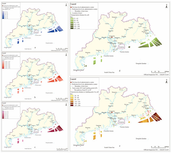 Layers of spatial variables at a spatial resolution of 1 km × 1 km. (a) Water depth, (b) air density at 119 m, (c) wind speed at 119 m, (d) transportation distance, and (e) transmission distance.