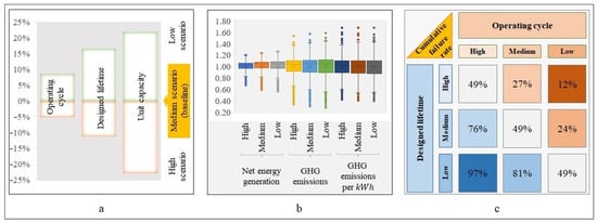 Box plots were used to indicate the dispersion degree of cells in the net energy generation layer, GHG emissions, and GHG emissions per . As shown in Figure 3b, the corresponding interquartile ranges of the GHG emissions per (high: from 0.59 to 1.4, medium: from 0.54 to 1.4, and low: from 0.54 to 1.4) were between those of the net energy generation (high: from 0.82 to 1.2, medium: from 0.81 to 1.2, and low: from 0.80 to 1.3) and GHG emissions (high: from 0.65 to 1.4, medium: from 0.59 to 1.4, and low: from 0.55 to 1.5) and were closer to the GHG emissions (dominated by the material flow [3]). This suggests that the impact on climate change per delivered to the grid was attributed to the multiple interactions of energy and material flows. Meanwhile, the dispersion degree decreased from the low to the high scenario combination, indicating that the higher technological level with a larger UC and longer DLT would smooth the differences due to resource conditions, such as wind speed and water depth.