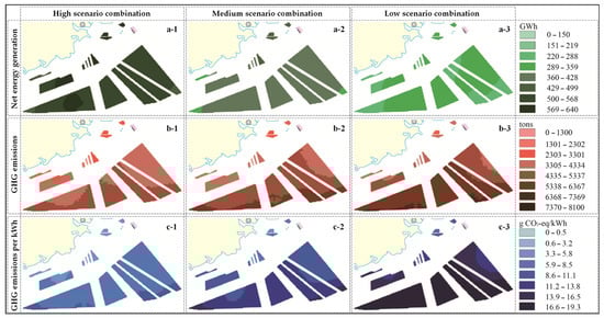(a-1–a-3) Net energy generation, (b-1–b-3) GHG emissions, and (c-1–c-3) GHG emissions per kWh by cell for an example with a partial view of the eastern Guangdong under the high, medium, and low scenario combinations, respectively.