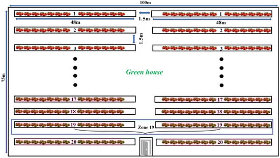 The greenhouse farm used in our study is located in the Ait Aamira region near Agadir. This region is known by the high production of tomatoes and closed greenhouses instead of open fields. The greenhouses studied in our research are located at 30°09′13″ N 9°30′50″ W. Figure 1 shows the greenhouses to be studied. The structure of the greenhouse is based on a plastic cover. The greenhouse studied in this research is divided into 20 regions. Each region contains two tomato rows with 100 m width and 75 m length with a 1.5 m between the rows. In addition, each region is divided in two rows, one with 48 m and the other with 48 m. Figure 2 shows the greenhouse structure and Figure 3 shows real images of the closed greenhouse used in this study.